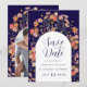 Ankündigen Sie Ihren besonderen Tag in Stil mit dieser Wildblume Foto Arch Fall navy blauen und weißen Hochzeit Save the Date. Dieses Design verbindet den herbstlichen Charme mit eleganter Eleganz und besticht durch handbemalte Aquarellfarben, die um einen anmutigen Bogen angeordnet sind. Die reichhaltige, saisonale Palette - Orange, Terrakotta, Braun, Orange, lila, Gelb, Korallen, gebrannte Zahl, Pfirsich und weiches Rosa - erweckt die Wärme und natürliche Schönheit des Herbstes. Elegante marineblaue Schrift gepaart mit moderner Typografie auf einem stilvollen, weißen Bogenhintergrund verleiht eine raffinierte Touch, während skurrile Blumen ein persönliches, boho-inspiriert Ambiente verleihen. Die leicht zu bedienende Vorlage enthält einen eigenen Foto-Bogen, der sich hervorragend eignet, um das glückliche Paar zu zeigen. Mit originellen Kunstwerken und einem Design der Künstlerin Catherine Sweetman Set dies Save the Date den Ton für eine gemütliche, romantische Feier und gibt den Gästen eine bezaubernde Vorschau auf die Zukunft.