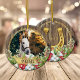 Personalisiertes Foto Weihnachtsschmuck mit dem Foto des Pferdes in Holzrahmen, Goldelementen, Weihnachtskranz und einem goldenen Pferdeschuh auf der Rückseite.