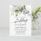 Moderne Kalligraphie Script, Elegant Watercolor Botanical Greenery Wedding Invitation Card beinhaltet Eukalyptus-Blätter, grünes botanisches Blattwerk, staubblaue Blätter und andere schöne botanische Vegetation. Foto zurück.