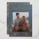 Diese elegante Hochzeitseinladung besticht durch eine vergoldete Blume aus Foto und Rose auf einem staubblauen Hintergrund. Braut und Bräutigam Namen in einem eleganten, handgeschriebenen Skript.