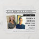 Spaß Save the Date nachahmen den Stil einer Zeitungsseite mit den Fotos der Braut und des Bräutigams und dem Hochzeitstag und -ort. Ein Zeitungshintergrund. Kühne Schriftart. Wirklich einzigartig und kreativ.