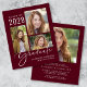 Eine preisgünstige bordeauxrote Abschluss-Ankündigung und Party Einladung mit einer drei Foto-Collage und "Graduate" in einem stilvollen weißen Drehbuch, und den Namen, das Klassenjahr und die Schule oder die Universität in der modernen weißen Typografie. Auf der Rückseite fügen Sie ein zusätzliches Bild und die Details der Graduierungsparty hinzu.