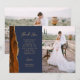 Schicken Sie Ihrer Familie und Ihren Freunden einen besonderen Hochzeitsdanken mit diesen maßgeschneiderten Fotokarten. Auf der rechten Seite wird ein vertikales Foto angezeigt. Auf der links erscheinen die Worte "Danke" in trendiger, goldfarbener Handschrift Schrift Typografie auf marineblau Hintergrund über eine kurze, bearbeitbare Botschaft des Dankes an Ihre Hochzeitsgäste in sans serif Schriftart, mit Ihren Namen unten. Ein verbrannter orangefarbener Wasserfarbenstreifen, der mit Imitaten bestickt ist, verziert den links Glitzer. Die Rückseite bietet Platz für ein zweites, horizontales Foto.