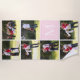 Machen Sie Ihr eigenes Badetuch mit einer Collage aus 7 Fotos Foto und Monogramm. Dieses personalisierte Design präsentiert sieben Fotos der Familie und Ihr Monogramm auf einem rosa, blütenrosa Quadrat. Fotografie © Storytree Studios, Stanford, CA