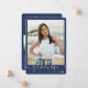 3 Foto Collage Abschluss Ankündigung für die Zeremonie der High School oder Uni-Abschluß und Open House Einladung verfügt über ein modernes und kühnes Kalligraphie-Skript mit Sans-Serif-Klasse von 2025 Schriftart und Raum auf der Rückseite für 2 zusätzliche Senior-Fotos oder Reise-Bilder auf einem minimalistischen marineblauen und goldenen Hintergrund mit optional abgerundeten Ecken.