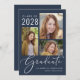 Einfache, dunkelblaue Abschluss-Ankündigung mit einer 3-Bild-Foto-Collage und "Graduate" in einem stilvollen weißen Skript. Fügen Sie den Namen, das Klassenjahr und die Schule oder Universität in der modernen weißen Typografie.