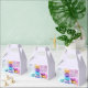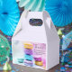 Eine winzige Geschenkbox mit einem köstlichen Foto mit einem Stapel farbenfroher Makaronen. Lebhafte Farben, die wirklich Pop.