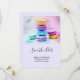 Save the Date Karte mit einem köstlichen Foto mit einem Stapel farbenfroher Makaronen.