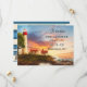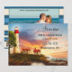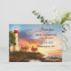 Küste Leuchtturm Save the Date Karte. Diese Save the Date Karte zeigt ein Retrogemälde eines Leuchtturms bei Sonnenuntergang. Auf der Rückseite ist Ihr eigenes Foto in einem nautisch gestreiften Design. Eine QR-Code-Vorlage bietet die Möglichkeit, einfach auf Ihre eigene Website zu verlinken.