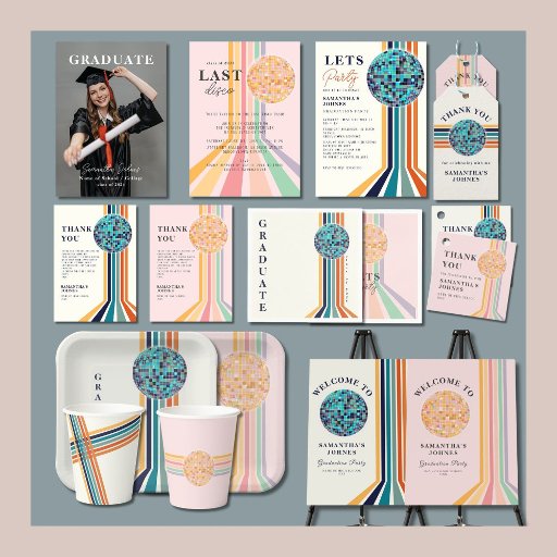 Erleben Sie den Rhythmus der Nostalgie und feiern Sie die Errungenschaften der strahlenden Klasse 2024 mit unserer Last Dance Retro Graduation Party Einladung. Diese faszinierende Einladung erfasst das Wesen einer vergangenen Epoche, kombiniert lebendige Farben, Discovibes und eine Touch von Regenbogenmagie, um die Bühne für ein unvergessliches Fest zu Set. Lass die Last Dance Retro Graduation Party Einladung ist Ihr Tor zu einer Nacht der Disco-Magie, wo Erinnerungen gemacht werden, und die Klasse von 2024 nimmt ihren letzten Bogen im Stil. Mit dieser lebendigen und unvergesslichen Einladung in die Zukunft!