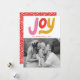 Kühne und moderne Ferienkarte mit rosa, roten und goldenen Buchstaben "Joy" und dem unten angezeigten Foto Ihrer Lieblingsfamilie. Personalisieren Sie die Vorderseite der farbenfrohen Urlaubskarte, indem Sie Ihren Namen und das Jahr hinzufügen. Die handgeschriebene Ferienkarte kehrt zurück, um ein Muster weißer Punkte auf einem roten Hintergrund zu zeigen. Entworfen, um sich mit unserer farbenfrohen Weihnachtskartenkollektion der Modernen Freude abzustimmen.