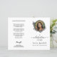 Modernes Mahnprogramm, das auf einem Papierblatt gedruckt wird, das Sie selbst falten. Das Beerdigungsprogramm zeigt das Foto Ihres Geliebten in einem handgezeichnet schwarzen Kranz auf weißem Hintergrund.