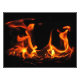 Dieses Foto zeigt die Feuerenergie in einem Holzofen. Die Flammen in Orange, Gold und Gelb erscheinen als fröhliche Tanzfiguren. Sie sind von einem schwarzen Hintergrund abgeschnitten.
