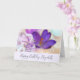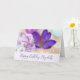 Geburtstagskarte mit einem hübschen Foto eines dunklen lila Krokus-Set in einem Glasgefäß. Im Hintergrund ist eine leichte lila Blüte zu sehen.