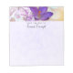 Ein Notizblock mit einem hübschen Foto eines dunklen lila Krokus-Set in einem Glasgefäß. Im Hintergrund ist eine leichte lila Blüte zu sehen.