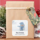Weihnachtsaufkleber mit einem niedlichen Foto eines kleinen Schneemanns. Stehend im Winter mit Schneefall. Dieser niedliche kleine Typ ist in blau gestricktem Hut und Schal gekleidet. Personalisieren mit einem Namen.
