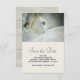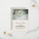 Weihnachts-Save the Date-Karte mit einem ruhigen Foto mit einem wunderschönen weißen Pferd mit einem kleinen Vogel, der auf seinem Hals ruht. Ein zauberhafter Winterschneefall verleiht dem Bild eine wunderbare mystische Qualität.