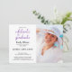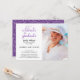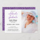 Versenden Sie coole, moderne, anpassbare Einladungen für Ihre Graduiertenfeier. Ersetzen Sie das Beispiel-Foto und den Text durch Ihren eigenen, um es einzigartig zu machen. Personalisieren Sie es für jeden Absolventen: High School, Uni, Graduate School, Jura Schule, Medizin, Fachschule. Die Einladung enthält die Worte "feiern den Absolventen" in einem violetten Aquarell-Script-Schriftart auf einem weißen Hintergrund. Die schwarzen Textfarben können durch Klicken auf die Schaltfläche "Anpassen" geändert werden. Auf der Rückseite trifft sich ein dekoratives, gemaltes Muster weißer Kurven, die auf einem violetten Hintergrund abweichen. Wenn Sie Probleme mit der Platzierung oder Größensortierung Ihres Fotos haben, klicken Sie bitte auf den Knopf "Anpassen" und verwenden Sie das Designwerkzeug, um es zu vergrößern/zu verkleinern oder zu verschieben. Wenn Sie Hilfe benötigen, kontaktieren Sie mich bitte. White Scrolling Curves on Violet pattern, Copyright ©Claire E. Skinner. Alle Rechte vorbehalten.