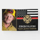 Dieses Design ist mit einer Feuerwehrflagge mit schwarz-weißen Streifen und einem dünnen roten Streifen versehen. "Glückwunsch" und das Abzeichen eines Feuerwehrmanns sitzen über dem Namen des schließend oder pensionierten Feuerwehrmanns, Leutnants oder Chefs. Feiern Sie stilvoll! Mit einem Foto des ausscheidenden Feuerwehrmanns können Sie sich noch weiter anpassen.