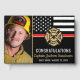 Dieses Design ist mit einer Feuerwehrflagge mit schwarz-weißen Streifen und einem dünnen roten Streifen versehen. "Glückwunsch" und das Abzeichen eines Feuerwehrmanns sitzen über dem Namen des schließend oder pensionierten Feuerwehrmanns, Leutnants oder Chefs. Feiern Sie stilvoll! Mit einem Foto des ausscheidenden Feuerwehrmanns können Sie sich noch weiter anpassen.