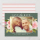 Stilvolle Hochzeit speichern Sie das Datum Ankündigung Karte Design verfügt über ein horizontales Foto Verlobung gerahmt durch eine hübsche Aquarellblütenanordnung mit grünem Blattwerk und Pastellrosa, Rosa, Pfirsichfrüchte und Sommer Dahlia und Rose Blume. Ein Muster aus weißen, horizontalen Streifen zieht die Rückseite der Karte nach oben. Die kräftigen Grün- und Hellrosa Hintergrundfarben können individuell auf Ihr Hochzeitsfarbschema abgestimmt werden.