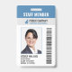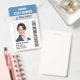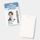 Ein modernes Mitarbeiter-ID-Abzeichen. Das Design beinhaltet Ihr Firmenlogo, Strichcode, Firmennamen und Tagelinie. Es zeigt ein großformatiges Mitarbeiter-ID-Foto. Die Informationen können personalisiert sein und beinhalten bis jetzt den Namen des Mitarbeiters, die Abzeichen-ID, das ausgestellte Datum und das Ablaufdatum. Ein Bar oben zeigt die Bezeichnung oder den Beruf des Arbeitnehmers in großen, fett gedruckten Buchstaben. Diese Bar kann auch verwendet werden, um eine Abteilung zu zeigen, wenn gewünscht.