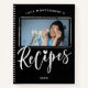 Foto Rezept Notebook, ideal für Brautpartys. In einem bezaubernden Schwarz-Weiß-Design werden Rezepte in einem Pinselskript unter einem Foto Ihrer Wahl geschrieben. Ein Herz dotiert das i. Ihr Foto passt in einen Rahmen gezeichnet weißer Linien. Geben Sie den Namen und das Jahr in modernen Buchstaben ein.