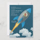 Lassen Sie sich von einem Party verwöhnen und beginnen Sie mit unserer Weltraumreiseeinladung mit einem grauen und blauen Raketenschiff im Mittelflug. Ein rundes Foto zeigt das Gesicht des lächelnden Jungen. (RP)