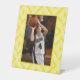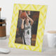 Zeigt dieses Foto Gelbes Drei-Tonen-Diamant-Muster Pedestal-Zeichen auf Ihrem Tisch an. Es zeichnet sich durch ein geometrisches Diamantenmuster in drei Gelbtönen um ein Foto herum aus. Personalisieren Sie es mit Ihrem Lieblingsbild. Eine großartige Geschenkidee für Oma oder Opa.