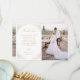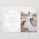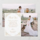 Schicken Sie Ihrer Familie und Ihren Freunden einen besonderen Hochzeitsdanken mit diesen maßgeschneiderten Fotokarten. Fügen Sie einfach ein horizontales Foto auf der rechten Kartenhälfte hinzu. Auf der links erscheinen die Worte "danke" in eleganter goldfarbener Schrifttyp-Typografie auf weißem Hintergrund über eine kurze, bearbeitbare Dankesbotschaft an Ihre Hochzeitsgäste in Vintagem Serif-Schriftart, mit Ihren Namen unten. Ein goldfarbener Rahmen von zarten botanischen Rebmotiven umrahmt den Text. Die Rückseite bietet Platz für ein zweites, horizontales Foto.