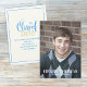 Dieses Design verfügt über eine Abschluss-Foto-Anzeigenkarte, Graduiertenfotoeinladung, mit der Klasse Ihres Jahres-Drehbuch, klassische Kalligrafie-Typografie-Schriftart, ein modernes trendiges, stilvolles Design, für einen eleganten Abschluss Party, High School oder Uni, ein einfaches Azurblau und Gold, Senior-Einladungen, mit 1 Foto volles Blende Kantenschablenkante Vorlage