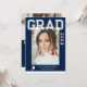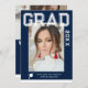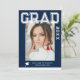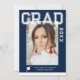 Foto Graduation Party Elegant Modern Script Invitations bietet Ihr Lieblings-Foto mit dem weißen Text "Grad (Jahr)" und Ihren Namen und personalisierte Abschluss Details auf der Vorderseite auf einem blauen Hintergrund. Auf der Rückseite fügen Sie ein zusätzliches Bild mit Ihren Abschluss Einladung Informationen unten. Personalisieren Sie den Text durch Bearbeiten in den bereitgestellten Textfeldern. Erstellt von ©Evco Studio www.zazzle.com/store/evcostudio
