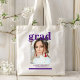 Foto Graduation Party Elegant Modern Script Tote Bag mit Ihrem Lieblings-Foto mit dem lila Text "Grad (Jahr)" und Ihrem Namen und personalisierten Abschluss Details auf der Vorderseite. Perfekt für den Absolvent als Abschluss Geschenk oder Abschlussfeier Dekor. Erstellt von ©2023 Evco Studio www.zazzle.com/store/evcostudio