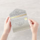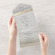 Einfache, elegante, minimale, moderne Kalligraphie, tropische Hochzeitseinladung mit Bild, Ozean und Sand-Muster und Imitats goldene Details. Fügen Sie Ihre Fotos, Ihre Hochzeitsdetails und uAwg.