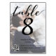 Diese Karte verfügt über Tischnummer und QR-Code für das Hochzeitsmenü auf der gleichen Seite.
