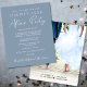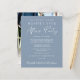 Günstige staubblaue Eleganz oder kleine Hochzeitsankündigung und Hochzeitsempfang Save the Date. Die Vorderseite zeigt "Save the Date für unser glückliches aller Zeiten nach dem Party" in einfacher Typografie und einem modernen Skript, Personalisieren Sie Ihre Hochzeitsankündigung und Empfang Save the Date und fügen Sie Ihre Namen in einem signaturähnlichen Skript. Auf der Rückseite finden Sie Ihr Lieblings-Foto, Ihre Vornamen, Hochzeitsdaten und Empfang.