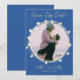 Mit diesem Foto können Sie Ihre Hochzeitskarte mit goldenen Herzen auf blauem Hintergrund veröffentlichen. Um das Bild zu personalisieren, ersetzen Sie es einfach mit Ihrem Lieblingsbild. Klicken Sie auf FIT oder FILL, um den Platz abzudecken, und achten Sie darauf, sich im Kreis zu zentrieren. Fügen Sie dann den Text in die Vorlage ein, und ersetzen Sie die Beispielnamen und das Datum. Der erste goldene Text beinhaltet: Save the Date, die Braut und der Groom's First Names and Wedding Date.