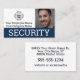Diese Visitenkarte zeichnet sich durch ein berufliches Design mit einem "SICHERHEIT"-Titel im unteren Teil über einem blauen Banner aus. Auf der rechten Seite befindet sich ein Beispiel-Foto für den Sicherheitsschutz, das Sie personalisieren können, um Ihre eigene Foto-ID einzufügen. Auf dem links wird ein Muster-Firmenlogo, gefolgt von einem Mitarbeiter- und Firmennamen, platziert. Die Informationen und Kontaktinformationen des Sicherheitsunternehmens oder der Firma werden auf der Rückseite platziert.