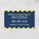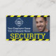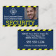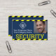 Diese Visitenkarte zeichnet sich durch ein berufliches Design aus. Der Titel "SICHERHEIT" wird in hellgelber Farbe über den unteren Teil auf einem marineblauen Hintergrund gedruckt. Auf der rechten Seite befindet sich ein Beispiel-Foto für den Sicherheitsschutz, das Sie personalisieren können, um Ihre eigene Foto-ID einzufügen. Auf dem links wird ein Muster-Firmenlogo, gefolgt von einem Mitarbeiter- und Firmennamen, platziert. Die Informationen und Kontaktinformationen des Sicherheitsunternehmens oder der Firma werden auf der Rückseite platziert. Ein hellgelb und schwarz gestreifter Vorsichtsstreifen grenzt an den oberen und unteren Bereich.