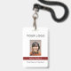 Corporate Style Mitarbeiter Foto ID Abzeichen mit einem einfachen Design. Ihr Firmenlogo ist oben, Ihr Foto oder QR-Code ist in der Mitte und unten ist Ihr Name über einem warmen bordeauxfarbenen Band zusammen mit Ihrem Titel darunter. Auf der Rückseite befindet sich ein Vorlagenfeld für optionalen Text, z. B. Ihre Kontaktinformationen. Die Farben von Band und Text können im Entwurfsbearbeitungsprogramm geändert werden.