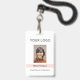 Corporate Style Mitarbeiter Foto ID Abzeichen mit einem einfachen Design. Ihr Firmenlogo ist oben, Ihr Foto oder QR-Code ist in der Mitte und unten ist Ihr Name über einem rot-rosa farbenen Band zusammen mit Ihrem Titel darunter. Auf der Rückseite befindet sich ein Vorlagenfeld für optionalen Text, z. B. Ihre Kontaktinformationen. Die Farben von Band und Text können im Entwurfsbearbeitungsprogramm geändert werden.