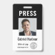 Personalisieren Sie diese Abzeichen mit Foto und Name des Journalisten oder Reporters, zusammen mit zwei Zeilen zusätzlichen benutzerdefinierten Textes für Titel oder Rolle, Medien-Outlet oder gültig bis zum Datum. Mit dem Logo für Unternehmen oder Medien. Die PRESSE erscheint oben in fett weißer Schrift. Zusätzliche benutzerdefinierte Textfelder auf der Rückseite für Rückgabeinformationen oder andere Details sowie eine Vorlage für einen Strichcode oder einen QR-Code.