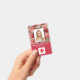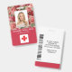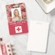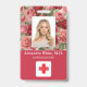 Foto ID Mitarbeiter Krankenhaus Medical Beruflich Abzeichen. Ein modernes, einfaches medizinisches berufliches Foto ID rote Abzeichen, die professionell als Online-Vorlage für eine Gesundheitseinrichtung oder ein Krankenhaus entworfen wurden, mit der Möglichkeit, das Foto des Personals, Logo-Vorlage, den Namen des Mitarbeiters und den beruflichen Titel zu ersetzen. Hübsche, feminine, mädchenhafte Gestaltung mit roten Farbblöcken und Vintag rosa rote Rosen auf Rose goldfarbenen Hintergrund. Fügen Sie auf der Rückseite weitere Informationen wie Rücksendeadresse, Bar und die Mitarbeiternummer hinzu. Ideal für runde Firmenlogos.