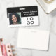 Dieses Abzeichen mit individueller Identifikation zeichnet sich durch ein Schwarz-Weiß-Design mit einem Beispielfoto zum verlassen Namen und Jobtitel aus. In der unteren rechten Ecke befindet sich ein Firmenlogo oder ein Firmenlogo, das Sie durch Ihr eigenes Logo oder ein anderes Bild ersetzen können. Die Rückseite des Foto ID Abzeichens enthält Kontaktdaten und zusätzliche Informationen.