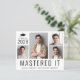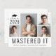 Budgetreue Master-Abschluss-Abschluss-Ankündigung und Party Einladung mit einer 4 Foto-Collage, "Mastered It" geschrieben unten in großen Hauptstädte Buchstaben und seine oder ihre Klasse Jahr, Name und Uni oder Universität in einfacher Typografie. Auf der Rückseite fügen Sie die Details der Graduierungsparty hinzu.