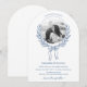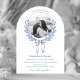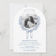 Diese elegante gewölbte Hochzeitseinladung besticht durch einen atemberaubenden, von Hand gezeichnet, kreisförmigen Blumenrahmen, der mit feinen Details gestaltet wurde. Ein bezaubernder Bogen schmückt die untere Mitte des Rahmens und verleiht dem Rahmen eine romantische Touch. Das Foto des Ehepaares liegt wunderschön im Zentrum des Designs und schafft eine persönliche und intime Touch. Die Einladung ist elegant beendet mit einer ausgeklügelten blauen Schrift, die zeitlosen Charme und Anmut ausstrahlt. Ideal für eine romantische und raffinierte Feier. Bitte kontaktieren Sie uns in Touch für Design-Hilfe via Zazzle Chat. Wir werden sicher sein, innerhalb von 12 Stunden zu antworten.