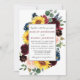 Moderne Elegante Wasserfarbe Burgundy Marsala Blumenrahmen Einladung umfasst burgundische Rose, rosa Rosen, rote Blume, blaue Blumen, Sonnenblumen, Eukalyptus-Blätter und botanische Vegetation. Foto zurück.