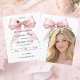 Verkünden Sie Ihren Meilenstein mit diesem Coquette-Abschluss-Save-the-Date. Das Design zeigt eine üppige rosa Schleife, verziert mit zarten Perlensträngen und einem klassischen Doktorhut-Symbol. Perfekt für die stylische Abiturientin, die ihr Porträt mit Familie und Freunden teilen möchte.