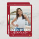 3 Foto Collage Abschluss Ankündigung für die Zeremonie der High School oder Uni-Abschluss und Open House Einladung verfügt über ein modernes und kaltes Drehbuch mit Sans-Serif-Klasse von 2023 Schriftart und Raum auf der Rückseite für 2 zusätzliche Senior-Fotos oder Reisefotos auf einem minimalistischen rot-weißen Hintergrund mit optional abgerundeten Ecken.