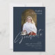 Diese 5" x 7" Abschluss-Ankündigung verfügt über ein bogenförmiges Foto auf marineblarem Hintergrund mit hellgrauem Schriftzeichen. Der Rücken hat ein bogenförmiges Foto mit dünnem Diamantliniendesign in hellgrau auf marineblau Hintergrund. Zu den Teilnehmern zählen der Name des Absolventen, die Uni oder der Universitätsname, der Grad, der Schwerpunkt des Abschlusses und eine zusätzliche Zeile für weitere Informationen wie z.B. Sonderehren.